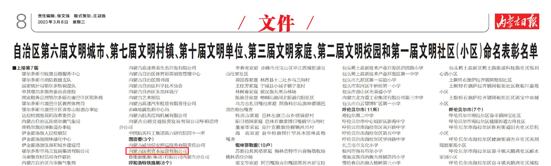 近日,内蒙古自治区党委 自治区人民政府对自治区第十届文明单位进行命名表彰,内蒙古国资运营公司精神文明建设工作得到肯定,获评“自治区文明单位”荣誉称号。